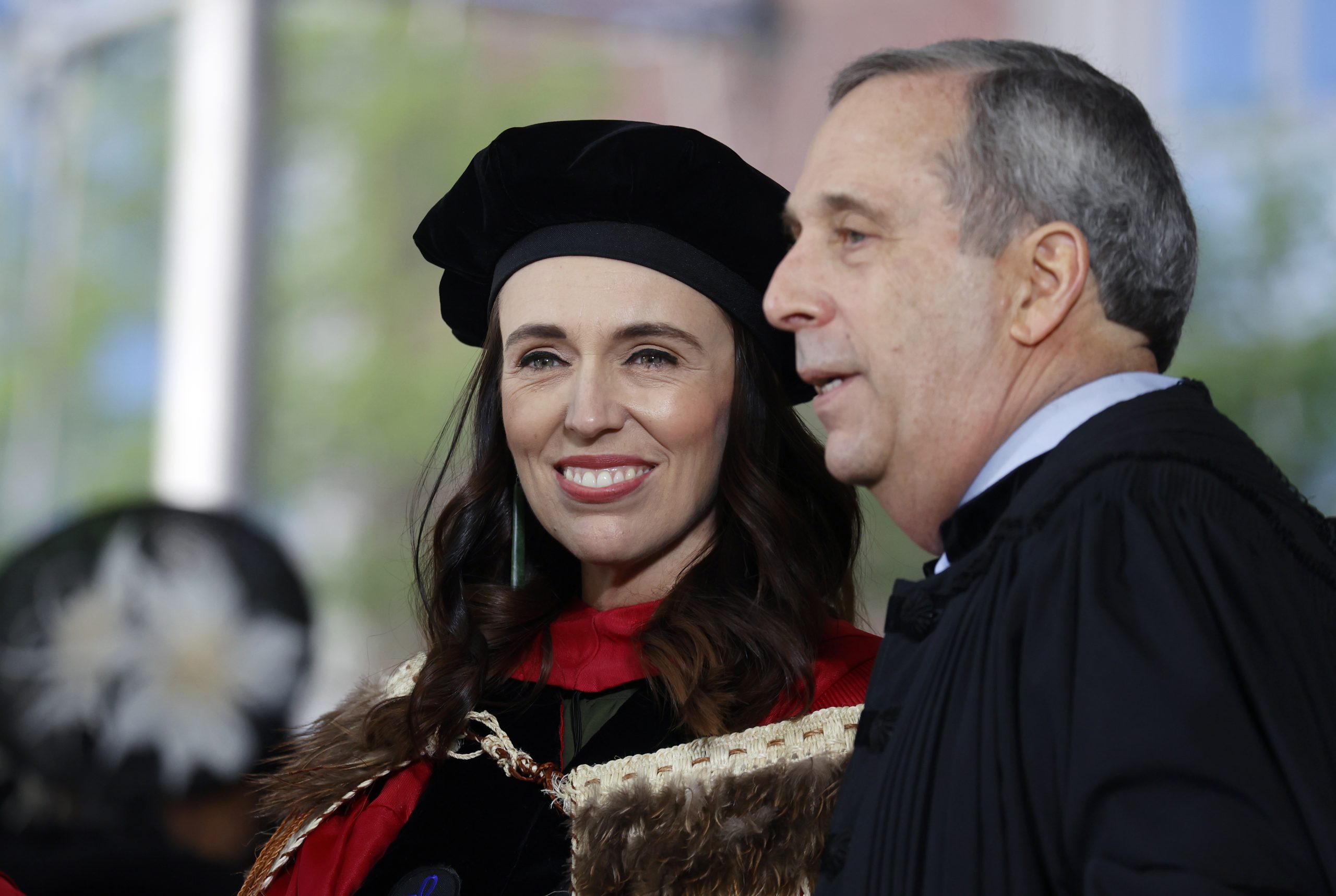 New Zealand Prime Minister Jacinda Ardern speaks with Harvard President Larry Bacow on the stage during Harvard’s 371st Commencement, Thursday, May 26, 2022, in Cambridge, Mass. Ardern was the keynote speaker and received an honorary degree. (AP Photo/Mary Schwalm)
