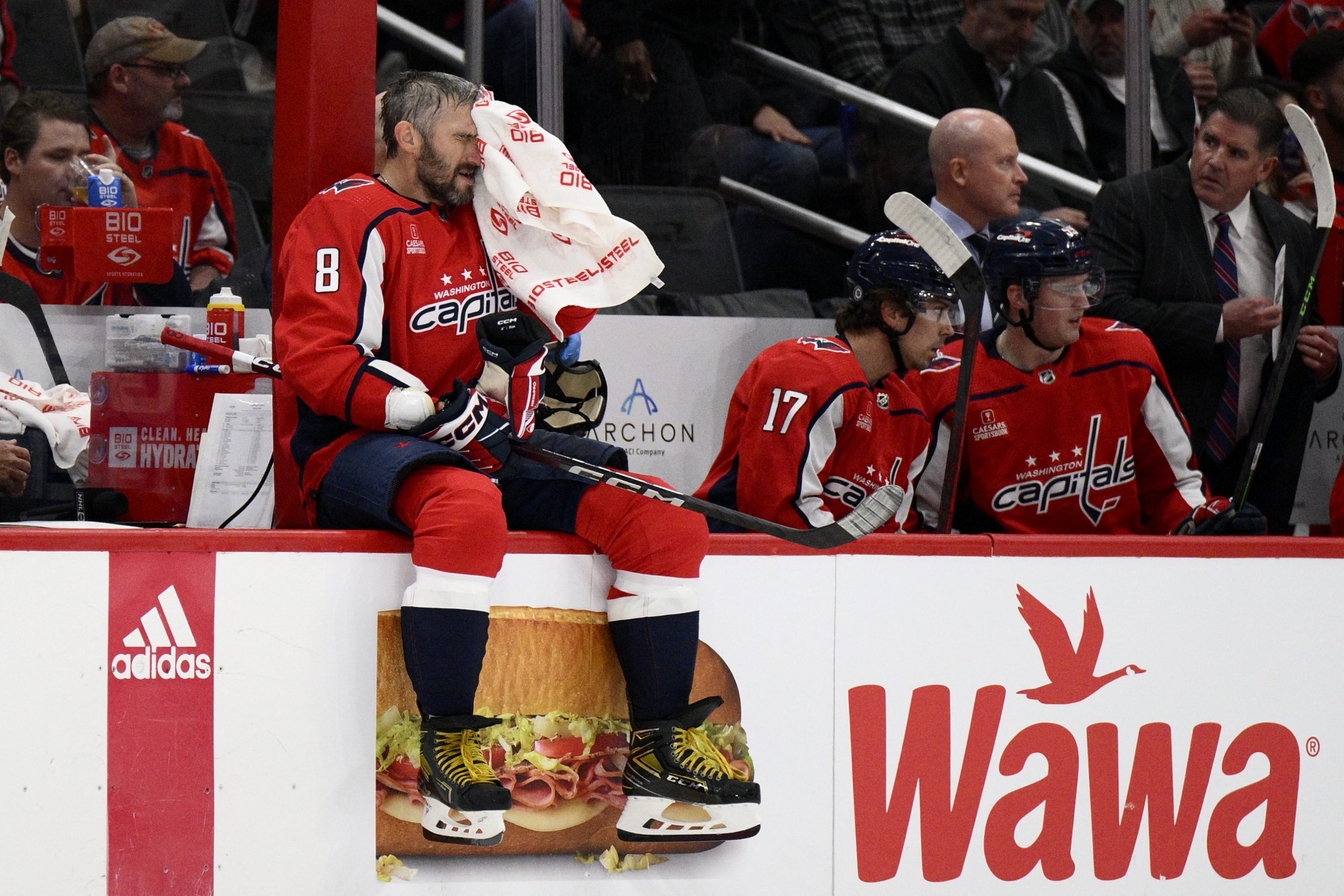 Washington Capitals left wing Alex Ovechkin (8) wipes his face during a break in the first period of the team’s NHL hockey game against the Boston Bruins, Wednesday, Oct. 12, 2022, in Washington. (AP Photo/Nick Wass)