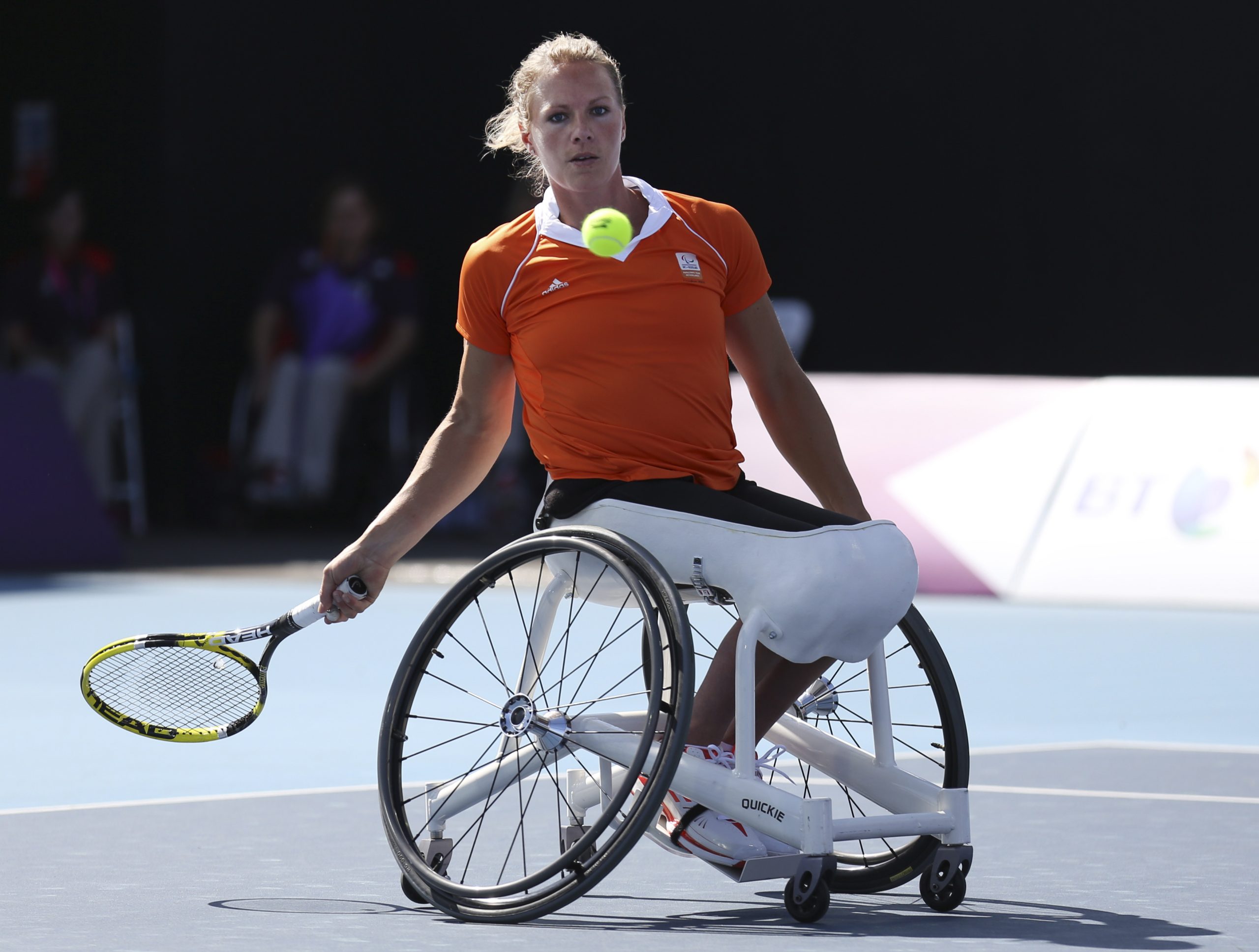 FILE – Netherlands’ Esther Vergeer returns to Netherlands’ Jiske Griffioen, not seen, during the women’s single wheelchair tennis semifinal match at the 2012 Paralympics, Wednesday, Sept. 5, 2012, in London. Vergeer won the match. Wheelchair tennis star Esther Vergeer will be inducted into the International Tennis Hall of Fame on Saturday, July 22. (AP Photo/Raissa Ioussouf, File)