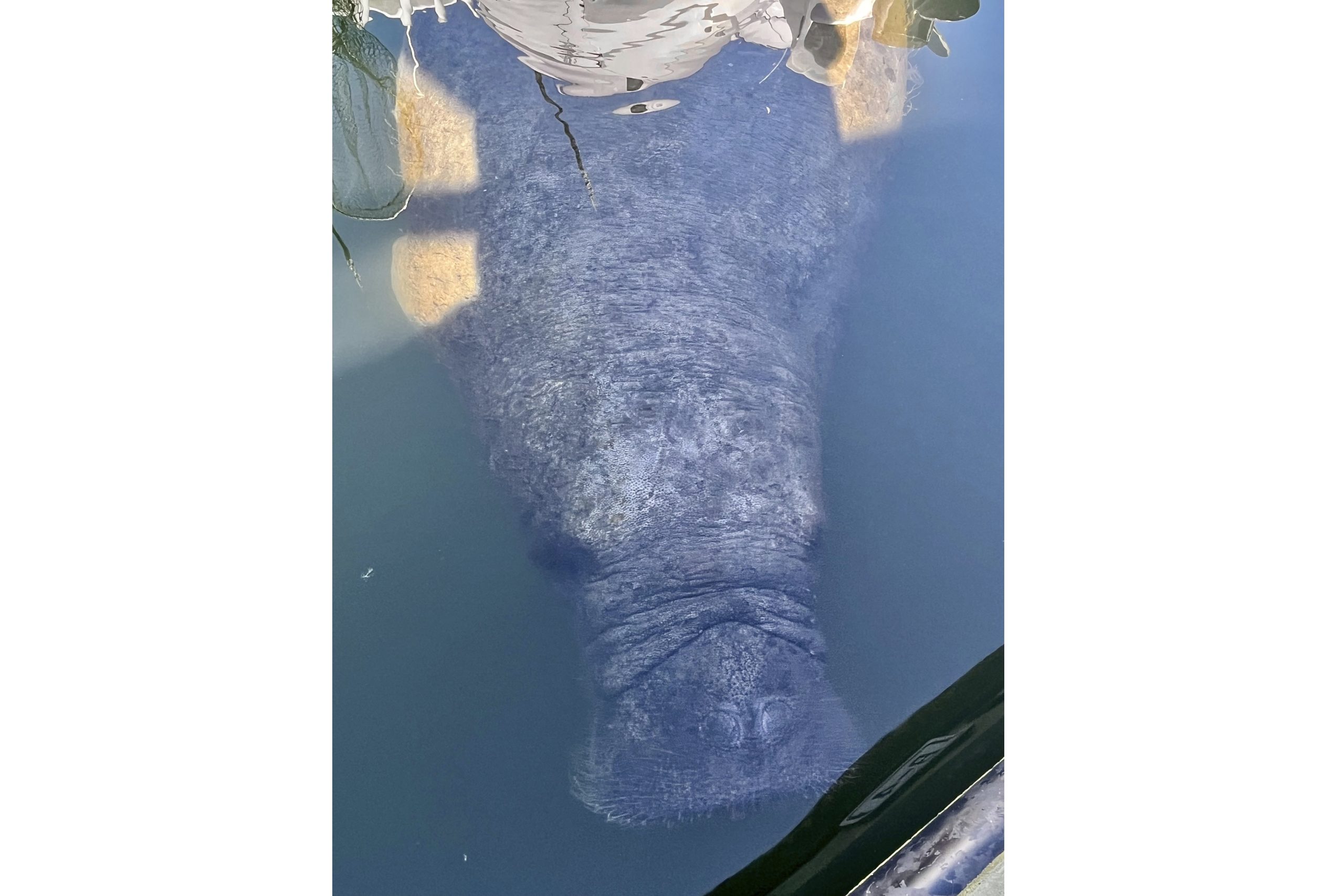 Staff from Mystic Aquarium’s Animal Rescue Program conduct a visual exam on a manatee at Point Judith Marina, Narragansett, RI., on Sept. 12, 2023. (Sarah Callan/Mystic Aquarium’s Animal Rescue Program via AP)