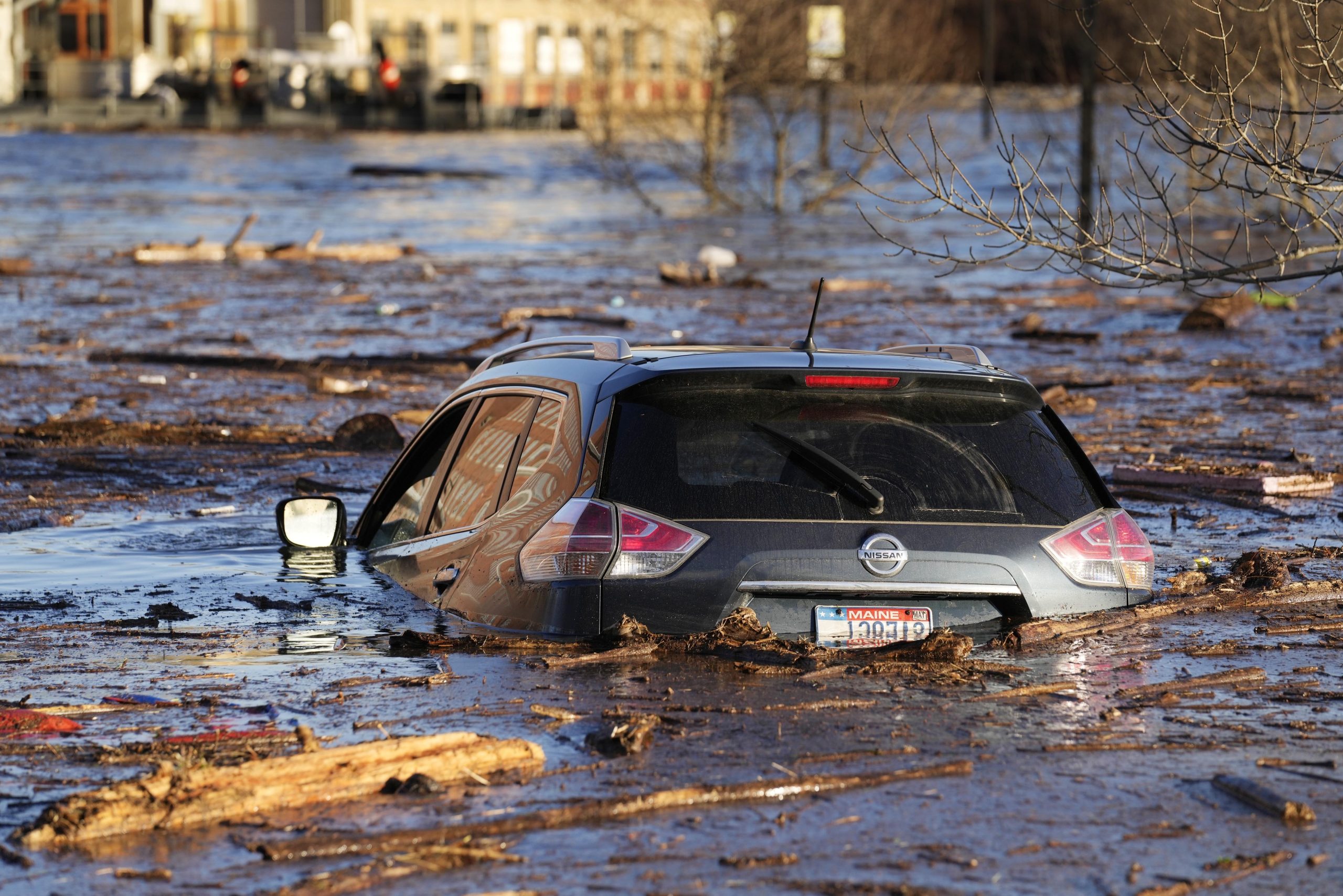 A car floats in a flooded parking lot at the Hathaway Creative Center alongside the Kennebec River in Waterville, Maine. A severe storm on Monday flooded rivers and knocked out power to hundreds of thousands. (AP Photo/Robert F. Bukaty)