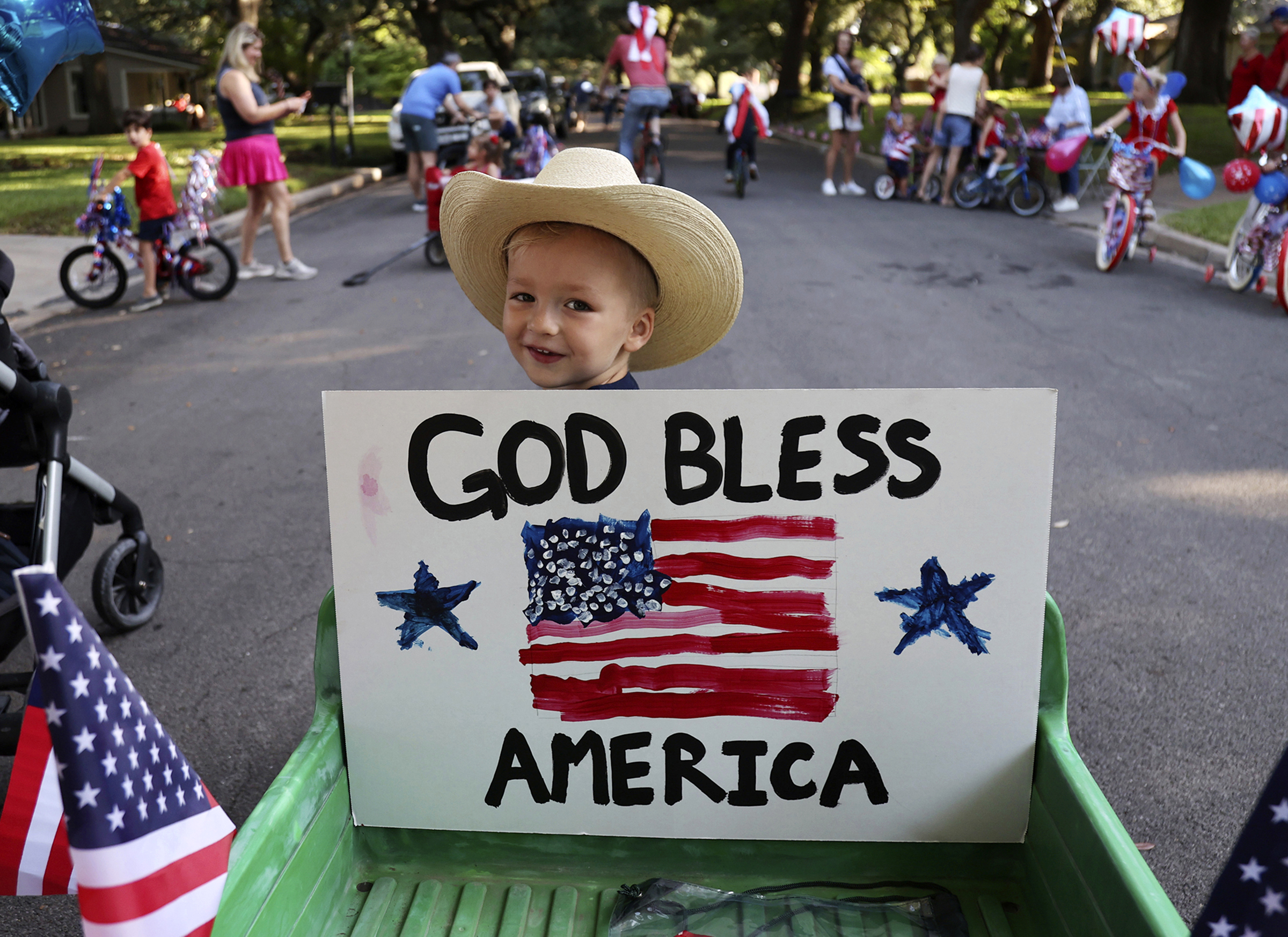 Niels Jacobsen, 3, waits for the Old Oaks neighborhood parade to begin on the Fourth of July, in Waco, Texas, Thursday, July 4, 2024. The parade is over thirty years old. (Jerry Larson/Waco Tribune-Herald, via AP) Credit: AP
