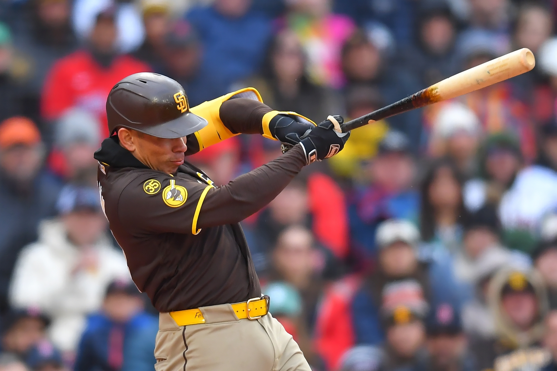 San Diego Padres’ Freddy Fermin hits a one-run double allowing Miguel Andujar to score in the third inning of a baseball game against the Boston Red Sox, Saturday, April 4, 2026, in Boston. (AP Photo/Steven Senne) Credit: AP